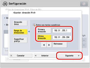 Pulse [Rango de direcciones] → pulse [Primera dirección] e introduzca '192.31.255.1' → pulse [Última dirección] e introduzca '192.31.255.254' con