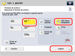 Seleccione [PDF] → [OCR (texto búsquedas)] → pulse [Aceptar].