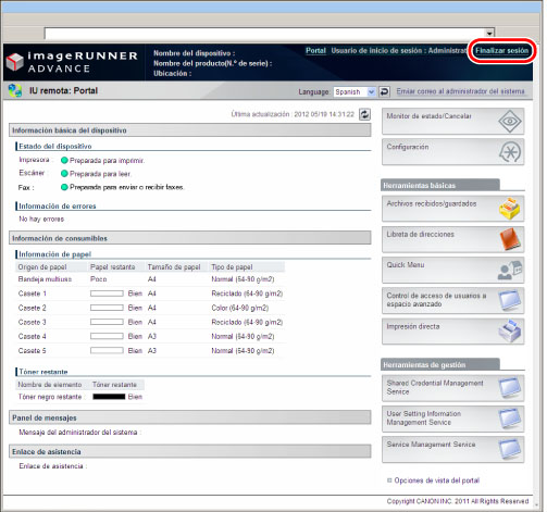 Las operaciones que hay disponibles en la pantalla Configuración pueden variar según se trate de un administrador o de usuarios generales.