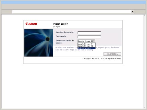 Seleccione el destino de inicio de sesión e introduzca un nombre de usuario y una contraseña para iniciar sesión en la IU remota o en una aplicación MEAP (incluidas las aplicaciones de inicio de sesión).