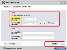 Si establece [BOOTP] o [DHCP] en 'On' en el paso 5, se sobrescribirá la dirección IP de un servidor DNS que haya establecido manualmente.