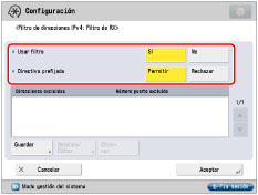 Si se intenta la transmisión/recepción de datos entre un dispositivo, cuya dirección IPv4/número de puerto se haya establecido para rechazarse, se generará un registro de bloqueo. Para mostrar el registro de bloqueo, "Comprobar el registro de bloqueo".