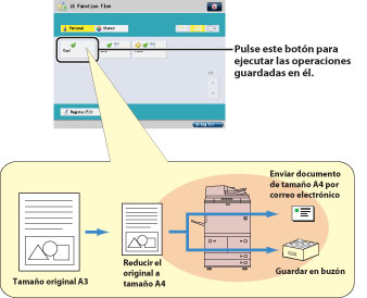 Por ejemplo, se puede leer un original A3, reducirlo a tamaño A4 y después enviarlo a un cliente por correo electrónico al tiempo que se guarda una copia de seguridad del archivo en un buzón, todo ello simplemente pulsando un botón.