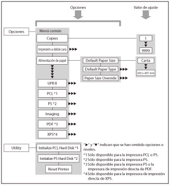 El menú Opciones de impresora permite acceder a opciones comunes. A continuación se muestra un esquema abreviado de la estructura del menú Opciones de impresora.