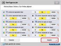 . Puede especificar el límite de páginas entre 0 y 999.999. Una vez alcanzado un límite de páginas, no es posible copiar, leer, imprimir.