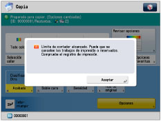 En la pantalla de funciones básicas de copia y en la pantalla Opciones de impresión aparecen los dos elementos para los que quedan menos páginas restantes. No obstante, si el más bajo es el límite de impresión total, sólo se muestra el límite de impresión total.