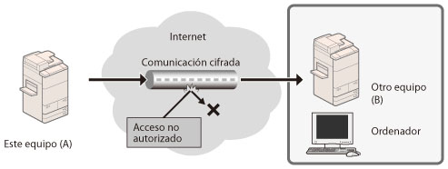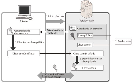 Puede lograr una comunicación cifrada segura cuando el usuario accede al equipo a través de un navegador web instalando un certificado de servidor en el equipo. Con la comunicación SSL, mediante el certificado de usuario y la clave pública se genera una clave común que sólo el usuario y el equipo pueden utilizar. De esta manera se puede impedir la intercepción y el robo de datos. Consulte