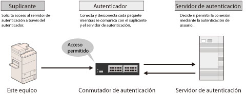 Gestiona toda la información de autenticación a través del servidor de autenticación (RADIUS: Remote Authentication Dial In User Service) y autentica al solicitante. Puede impedir el acceso no autorizado, ya que únicamente el solicitante autenticado por el servidor RADIUS tiene permiso para conectarse a la red por parte del autenticador.