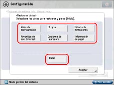 Si no se restauran los datos para [Valor de configuración] y [Libreta de direcciones] al mismo tiempo, es posible que las opciones de [Opciones env. URL] para [Establecer buzón de fax/I-fax] y [Opciones de buzón] se borren.