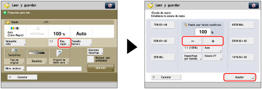 Pulse [Esc. copia] → ajuste la escala de zoom con [-] y [+] → pulse [Aceptar].