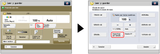 Pulse [Esc. copia] → [Especificar por tamaño].