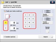 Pulse [X] o [Y] → introduzca el tamaño de lectura en mm.