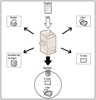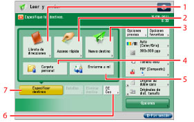 Si pulsa [Leer y enviar] en la pantalla del menú principal, aparece la pantalla de funciones básicas de Leer y enviar. La función Enviar permite leer documentos y enviarlos a destinos especificados mediante e-mail o I-fax, guardarlos en un servidor de archivos o guardarlos en un buzón para procesarlos en otro momento. Puede enviar documentos a varios destinos simultáneamente utilizando varios métodos de envío, como e-mail e I-fax.
