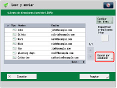 El número de resultados de búsqueda que aparecen no superará el límite máximo establecido en [Servidor LDAP]. Si no aparece el destino que desea, aumente el número máximo de direcciones para buscar o cambie los criterios de búsqueda. (Consulte "Opciones de servidor LDAP".)