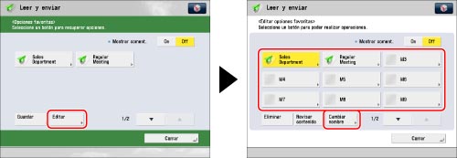 Pulse [Editar] → seleccione el botón cuyo nombre o comentario desea editar → pulse [Cambiar nombre].