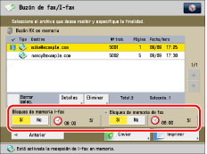 Si se desactiva <Bloqueo de memoria de fax> y/o <Bloqueo de memoria I-fax>, los archivos recibidos mediante la función de fax/I-fax se imprimen automáticamente y se eliminan del buzón de recepción en memoria.
