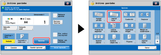 No es posible seleccionar varios archivos y especificar las opciones de las hojas insertadas de todos ellos al mismo tiempo. En ese caso, active el modo Separador de trabajos. (Consulte "Separador de trabajos".)