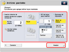 Si selecciona [Dejar en blanco] para la inserción de hoja, podrá establecer la misma página para el papal de separadores. En este caso, el papel para inserción de hoja saldrá primero, y después saldrá el papel de separadores.