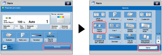 Sólo es posible cambiar aquellas opciones que aparezcan en [Cambiar opciones] mientras se encuentra en el modo Formar trabajo. Debe especificar de antemano las opciones necesarias de copia. Sin embargo, si especifica [N en 1] con el modo Formar trabajo, no es posible cambiar las opciones para [Densidad] o [Esc. copia].