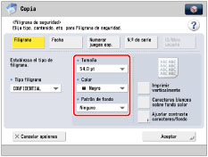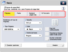 El texto que introduzca en [Person.] no se guarda automáticamente. Si usa [Filigrana de seguridad] y desea guardar la filigrana de seguridad recién creada para seleccionarla cuando lo necesite, pulse [Guardar] → introduzca el texto que va a guardar.