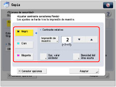 La opción [Ajustar contraste caracteres/fondo] se cancela cuando finaliza el trabajo. Si desea utilizar las mismas opciones para el siguiente trabajo de copia, vuelva a especificar la configuración.