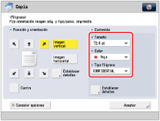 Si establece dos de los modos [Numerar páginas], [Numerar juegos cop.] o [Imprimir fecha] para imprimir en la misma posición, aparece un mensaje de confirmación al pulsar