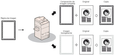 Este modo le permite superponer a la copia o impresión una imagen previamente leída (figura de imagen) guardada en la memoria del equipo.