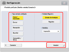Si establece [Copia/Impresión], [Estado de trabajos], [Impresión] como Pantalla prefijada (Monitor estado/Cancelar):