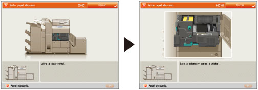 Es posible que algunas zonas para las que se indica que hay atascos de papel, en realidad no tengan ninguno. No obstante, compruebe siempre todos los sitios indicados en la pantalla táctil en el orden en que aparecen.