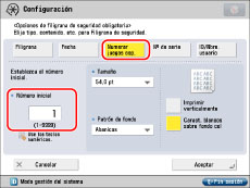 Para conocer las instrucciones acerca de la introducción de caracteres, consulte "Introducir caracteres desde la pantalla táctil". Si ha guardado caracteres en [Guardar caract. para numerar págs./Filigrana] en [Opciones de funciones] (Configuración), puede seleccionarlos de la lista.