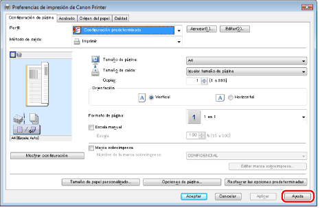 Puede mostrar la ayuda en línea haciendo clic en [Ayuda] en la pantalla del controlador de impresora.