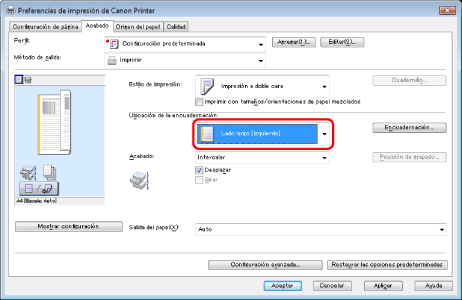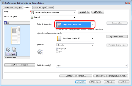 El valor predeterminado de [Estilo de impresión] es [Impresión a doble cara]. También puede cambiar el valor predeterminado a [Impresión a una cara]. Para obtener instrucciones sobre cómo cambiar los valores predeterminados, consulte "Configurar las opciones de impresión prefijadas".