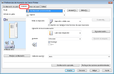 Para conocer las instrucciones acerca de cómo mostrar la pantalla del controlador de impresora, consulte "Impresión" o "Configurar las opciones de impresión prefijadas".