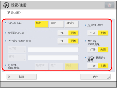 为<发送前POP认证>按[打开]→<SMTP认证(SMTP AUTH)>按[关闭]。