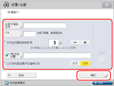 如果事先已经为单独的存储箱指定了上述设置,则不论每个存储箱的PIN设置如何,都可以为“设置/注册”的[功能设置]中[全部存储箱的设置]指定[文件自动删除前的时间]和[从打印机驱动程序存储时打印]。但是,如果使用[全部存储箱的设置]后单独更新了每个存储箱的设置,则更新的设置优先于使用[全部存储箱的设置]设置的设置。 (请参阅“指定全部存储箱的设置”)