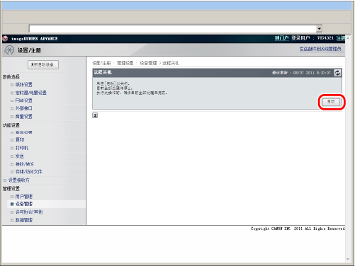 可以从“远程用户界面”使用“远程关机”模式关闭本机。