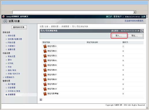 如果导入设备设置,会同时导入“地址列表”,从而会使已注册的接收方被删除或被导入的文件中的接收方覆盖。