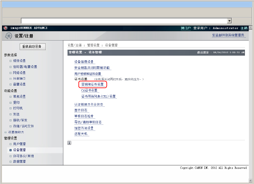 本机中已注册预装的密钥对和服务器证书。也可以使用预装的密钥对和服务器证书来执行加密SSL通信。也可以使用从本机的操作面板注册和生成的密钥对和服务器证书进行加密SSL通信。