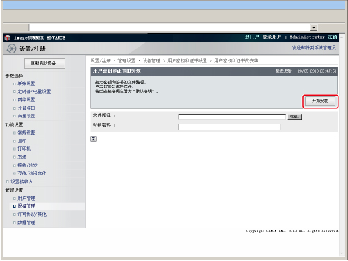 最多可以安装100个用户证书文件,每个用户最多拥有一个用户证书。如果尝试安装100个以上的证书文件,或者为一个用户安装多个用户证书文件,则按[开始安装]后会显示错误。