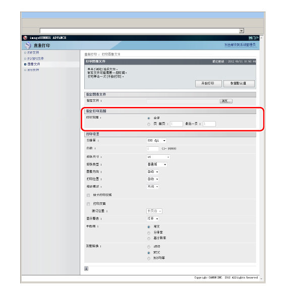 要通过指定URL进行打印,必须将“设置/注册”的[管理设置]中[远程用户界面]中的[使用参考打印]设置为“打开”。