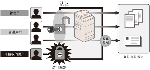 管理员通过限制普通用户的访问和使用认证模式设置操作限制来管理用户。每个用户均可设置普通用户权限。通过阻止来自未授权用户的访问,管理员可以降低随意操作本机和信息泄漏的威胁。