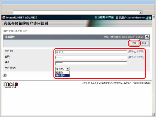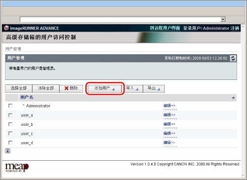 只有“高级存储箱”管理员可以在[高级存储箱的用户访问控制]的[用户管理]页面上注册/编辑用户信息。普通用户只能更改自己的密码。(请参阅“以普通用户身份编辑用户信息”)