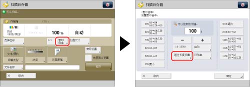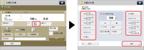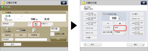 如果将原稿放置在稿台玻璃上,假设可以检测到原稿尺寸,则关闭输稿器后会自动出现缩放倍率。