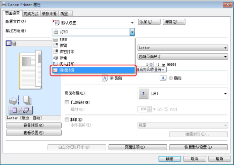通过指定“控制面板”(不是应用程序中)上的打印机驱动程序屏幕中的打印设置,可以将这些设置注册为默认设置。对于Windows XP,要在操作面板中显示打印机驱动程序屏幕,请单击[开始]→[打印机和传真](或[开始]→[控制面板]→[打印机和其他硬件]→[打印机和传真])→右键单击打印机图标→单击[打印首选项]。对于Windows Vista,单击[
