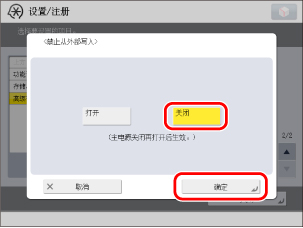 (设置/注册)→[功能设置]→[存储/存取文件]→[高级存储箱设置]→[禁止从外部写入]。
