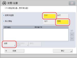 按<使用筛选器>的[打开]→按<默认策略>的[拒绝]→按[注册]。