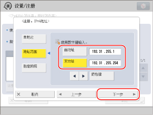 按[地址范围]→按[首地址]并输入“192.31.255.1”→按[末地址]并使用