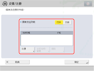 (设置/注册)→[功能设置]→[发送]→[电子邮件/互联网传真设置]→[限制发送接收方域]。