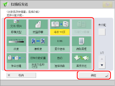 “扫描后发送”屏幕上显示两个选项快捷键。[双面原稿]和[不同尺寸原稿]显示为默认设置。这些快捷键可以更改为常用的功能。
