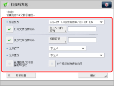 选择此按键设置用于打印或编辑已扫描PDF的密码。如果选择该键,则可以指定如<允许打印>、<允许更改>和[启用可访问性、复印和图像/文本提取]的设置。
